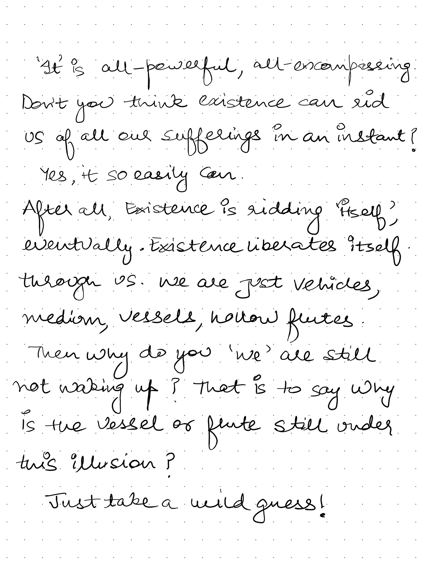 After all, existence is ridding itself, eventually. Existence liberates itself through us. We are just vehicles, mediums, vessels, hollow flutes.